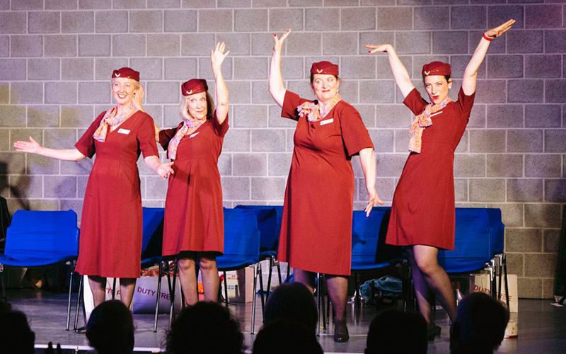 Zwischen den musikalischen Darbietungen gibt es reichlich Geplauder: von „Girl Talk“ über „All about that Bass“ bis hin zu „Campari Soda“ von Taxi oder „Ne t’en vas pas!“. Mal im gemeinsamen Spiel, mal im Wechsel versprechen die musikalischen Höhenflüge staunenswerte Momente für die Passagiere. In Zeiten des Klimawandels können Sie mit uns reisen und gleichzeitig Ihren ökologischen Fussabdruck erheblich reduzieren! Das Boarding ist abgeschlossen! Wir bitten Sie nun, Ihre Tische hochzuklappen, die Sitzlehnen aufrecht zu stellen und sich anzuschnallen! Die Crew ist startklar! Geniessen Sie Ihren Flug!